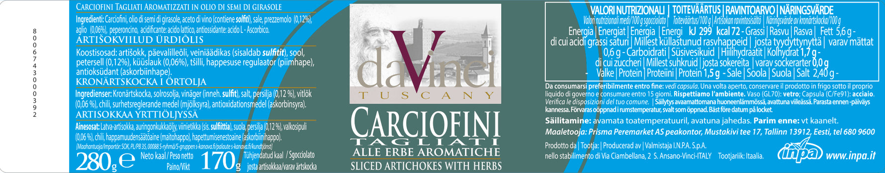 I carciofini sottolio DA VINCI sono ideali per antipasti in abbinamento a salumi e for-maggi, primi piatti freddi, secondi piatti oppure inseriti nelle insalate, farcire panini e focacce o guarnire pizze.
