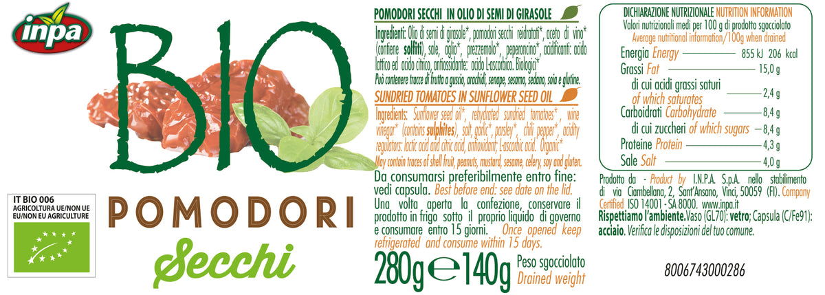Metodo di conservazione: Dopo l'apertura conservare in frigo ricoperto di olio e consumare entro 2 settimane