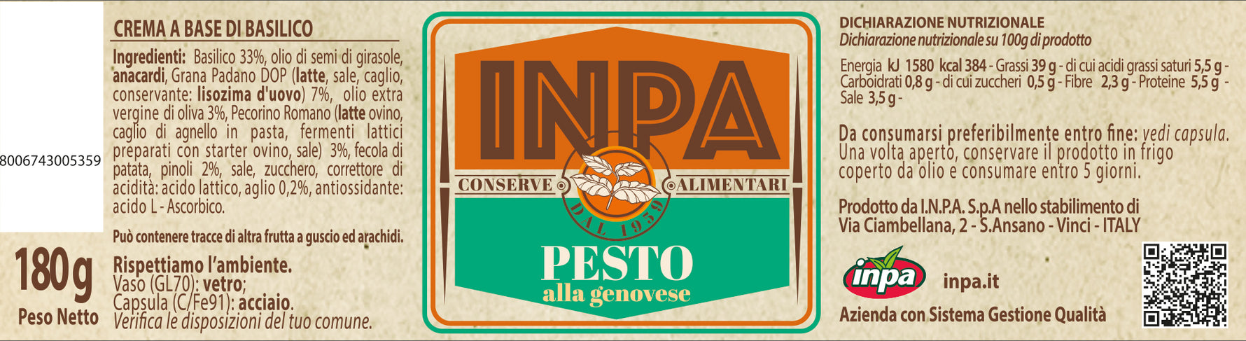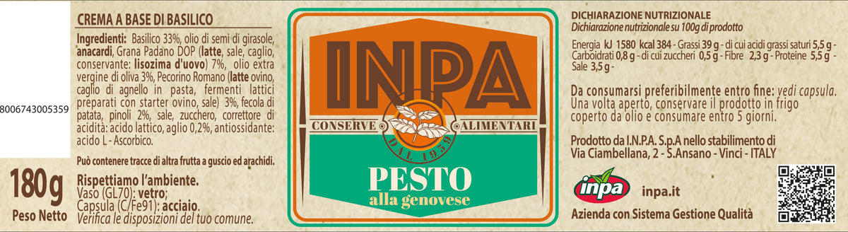 Preparato secondo tradizione; basiclio, formaggio Grana Padano, olio extra vergine di oliva, Pecorino Romano e pinoli sapientemente mixati per portare sulla tua tavola gusto e freschezza!